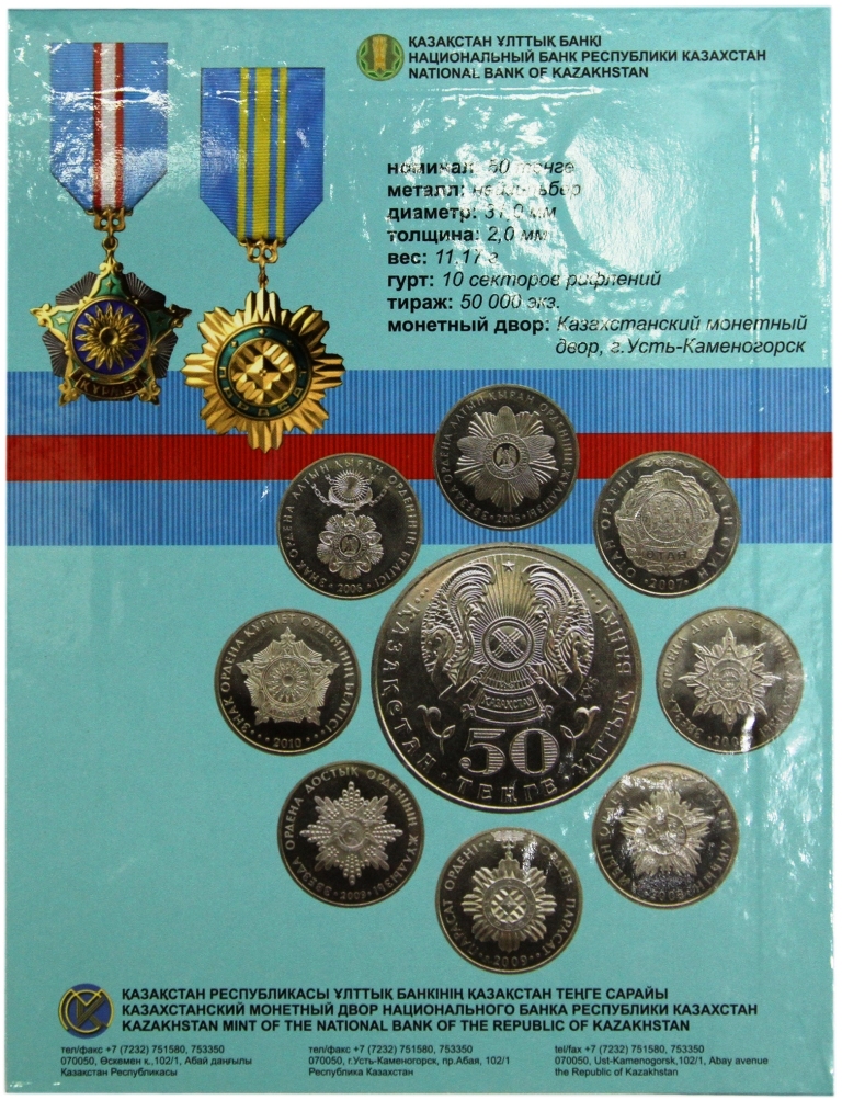 Наименование: Казахстан 50 тенге 2006-2010 год.Полный набор монет из 8 шт.в официальном альбоме,серия:"Государственные Награды Казахстана",UNK,без обращения